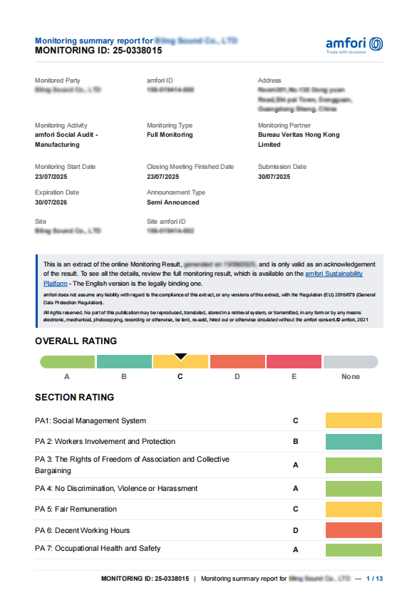 祝贺东莞LW电子科技有限公司顺利通过BSCI认证拿到C级BSCI验厂报告