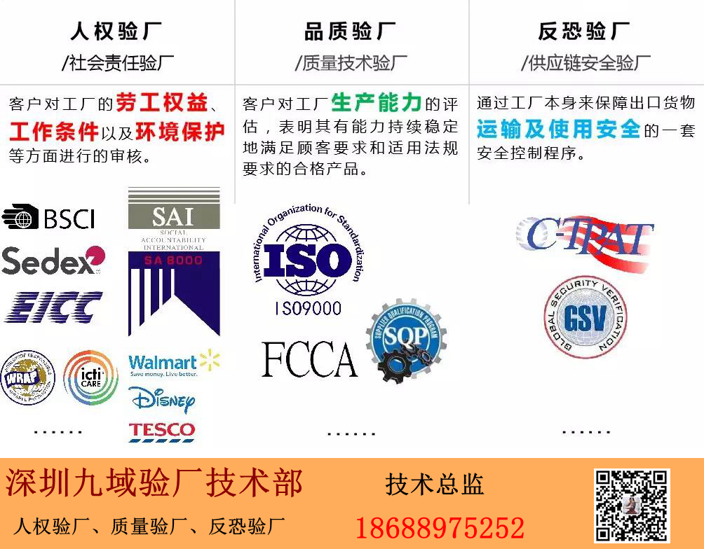 Supplier Compliance Audit Network(SCAN)验厂标准旨在为客户提供全面的供应商评估和审核服务,以确定供应商是否符合行业标准规范、国家法规、客户公司要求及相关社会责任方面的要求,确保其安全和合法的供应产品和服务。SCAN 验厂标准要求供应商遵守以下具体标准:1.管理体系认证:针对不同体系的供应商,要求供应商拥有合法的管理体系认证证书,如ISO 9001、ISO 14001、ISO45001等;2.安全及合规:对产品、原材料或包装的合法性、安全性及符合性,要求供应商提供认证、检测报告、申报文件及历史记录;3.质量控制:要求供应商实施有效的质量控制体系,以确保所提供产品符合客户要求;4.社会责任:要求供应商符合有关劳动法律法规、政府法规和国际公约的要求;5.健康及安全:要求供应商遵守安全工作标准,包括职业健康及安全管理,以确保工作人员获得安全、健康的工作环境;6.保护环境:要求供应商保护环境和实施可持续发展战略,严格遵守环境保护政策、法规及标准;7.其他要求:要求供应商履行其他有关社会责任,如:贸易法、消费者保护法、安全法等。遵守Supplier Compliance Audit Network(SCAN)验厂标准有助于供应商提高服务质量和达到相应的社会责任要求。